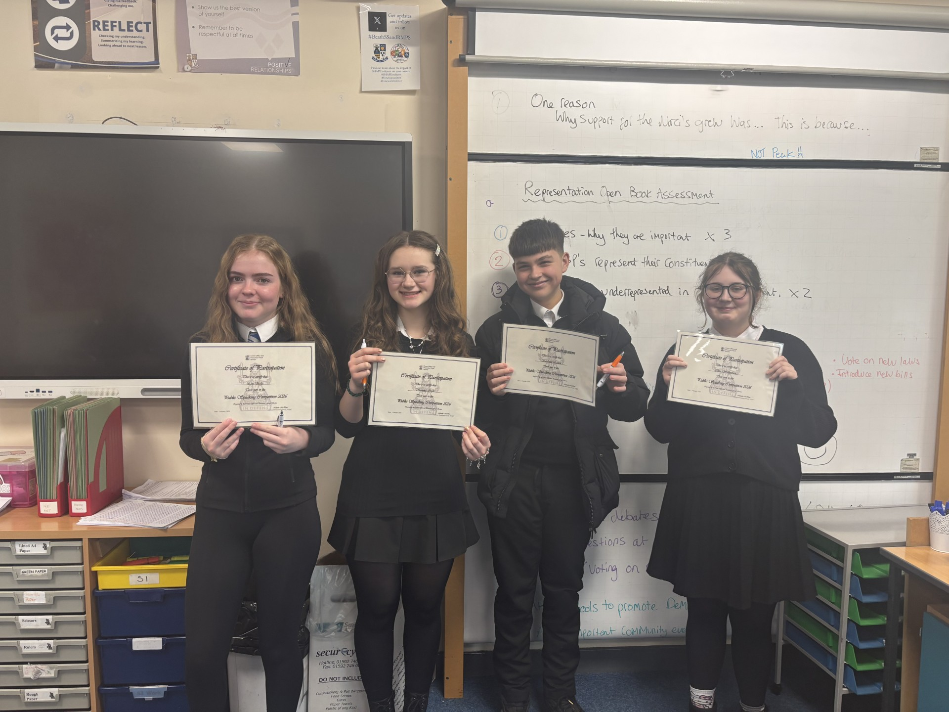 Kaidance Easton and Chloe Walkershaw (Team 1) Susanna Inglis and Eva Kelly (Team 2) all recently participated in the 2026 COPFS Public Speaking Competition representing Beath High School. Both teams were required to prepare a talk about the question “Should pupils be banned from having mobile telephones in schools?” and debate this issue with other teams from different secondary schools across Fife Council.