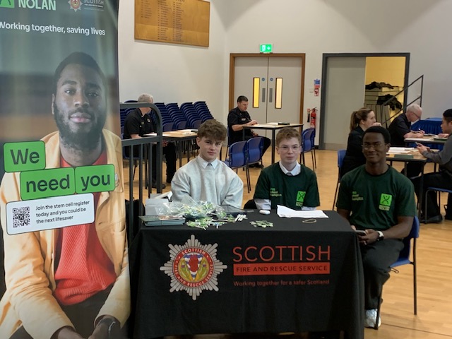 Following an informative presentation in the S5 Assembly last week, SFRS joined us again in Beath today in partnership with the Anthony Nolan Trust for a stem cell donor event. S5 and 6 pupils along with staff were invited to register as potential stem cell donors and over 50 pupils and staff came along to sign up.
