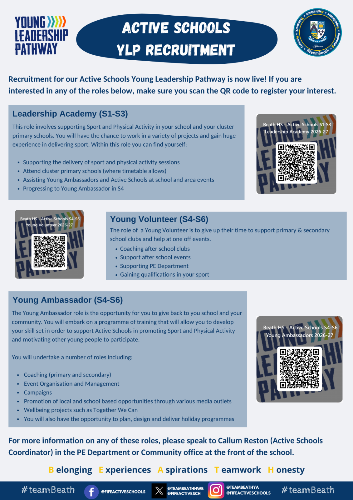 These roles directly contribute to the success of sport across Beath HS and our wider cluster primary schools as well. Each role gives young people a unique opportunity to make a difference in the #teamBeath community.